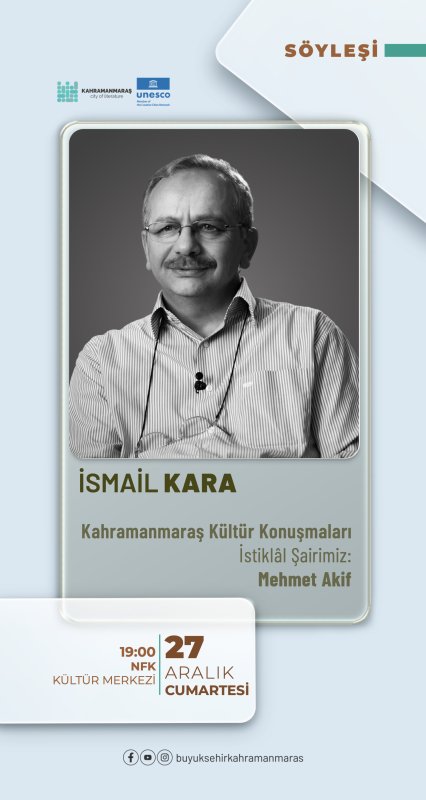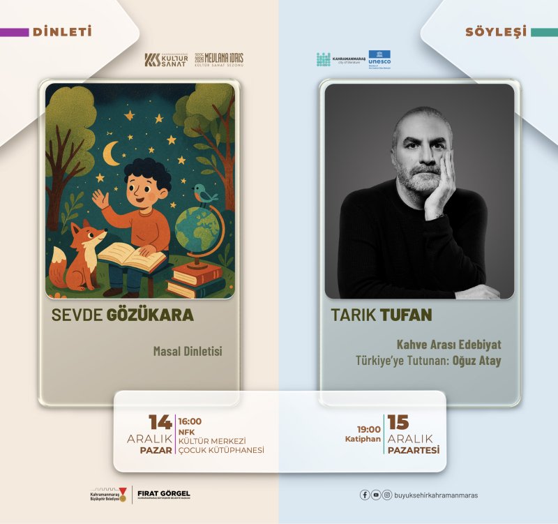 Ay boyunca Necip Fazıl Kısakürek Kültür Merkezi Araştırma Kütüphanesi, edebiyat dünyasının önemli isimlerini ağırlayacak. 6 Aralık Cumartesi günü Aykut Ertuğrul ve Mehmet Cemil, 20 Aralık Cumartesi günü ise Yusuf Genç ve Mustafa Armağan okurlarıyla bir araya gelecek. 27 Aralık Cumartesi günü saat 19.00’da ise “İstiklal Şairimiz: Mehmet Akif” konulu söyleşide İsmail Kara, okurlarla buluşacak. Büyükşehir Belediyesi ayrıca kültür sanat etkinliklerini ilçelere de taşıyarak Çağlayancerit’ten Andırın’a, Göksun’dan Elbistan ve Türkoğlu’na kadar pek çok noktada yazar buluşmaları düzenleyecek.