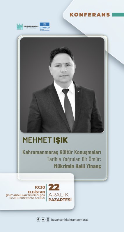 13 Aralık Cumartesi günü gerçekleştirilecek Kahramanmaraş Kültür Konuşmaları programında Aysun Ezgi Yılmaz, Kadirhan Özdemir ve Abdulkadir Önkol edebiyatseverlerle buluşacak. Aynı gün saat 19.30’da düzenlenecek Şeb-i Arus programı ise Mevlana’nın vuslat yıl dönümüne özel manevi bir atmosfer oluşturacak.