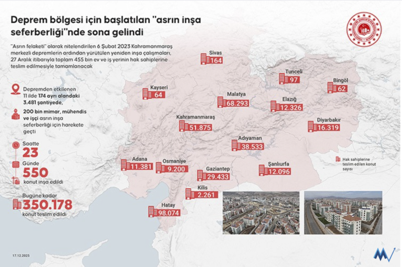 Bugüne kadar ise 68 bin 293'ü Malatya'da, 51 bin 875'i Kahramanmaraş'ta, 38 bin 533'ü Adıyaman'da, 29 bin 433'ü Gaziantep'te, 98 bin 74'ü Hatay'da, 12 bin 326'sı Elazığ'da, 11 bin 381'i Adana'da, 9 bin 200'ü Osmaniye'de, 2 bin 261'i Kilis'te, 16 bin 319'u Diyarbakır'da, 12 bin 96'sı Şanlıurfa'da, 62'si Bingöl'de, 64'ü Kayseri'de, 97'si Tunceli'de ve 164'ü Sivas'ta olmak üzere 11 ilde 350 bin 178 konutun anahtarı hak sahiplerine verildi.