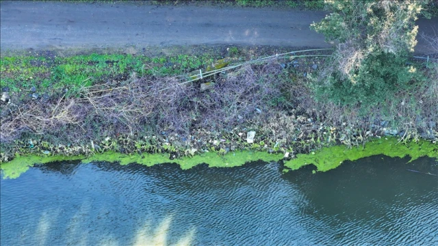 Barajın kıyısındaki kirlilik, havadan dronla görüntülendi.