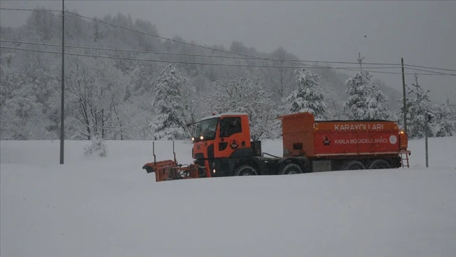 Karayolları ekipleri, güzergahta kar küreme ve tuzlama çalışması yürütüyor.