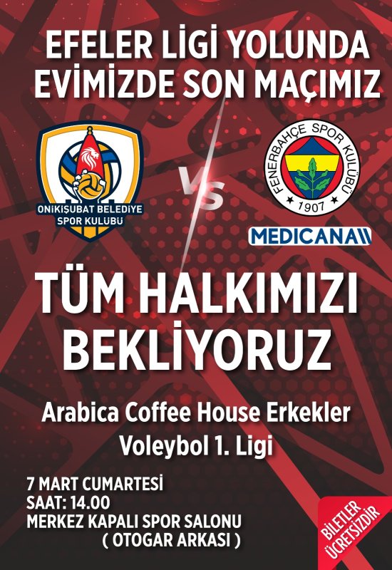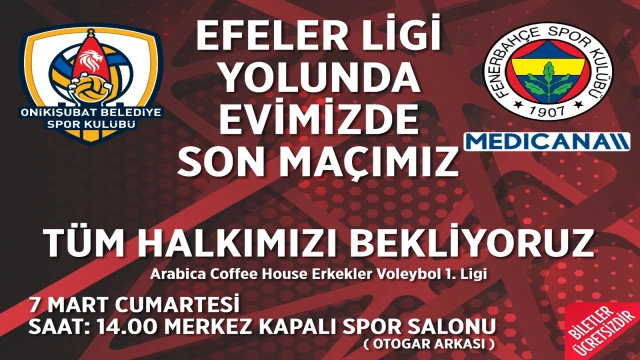 Sezon boyunca ortaya koyduğu mücadeleci oyun, azim ve takım ruhuyla dikkat çeken Onikişubat Belediye Spor Kulübü Erkek Voleybol Takımı, taraftarının desteğini arkasına alarak önemli bir galibiyet hedefliyor. Sahada ter döken Filenin Aslanları, sezonun evindeki son maçında Kahramanmaraşlı voleybolseverlerle birlikte büyük bir atmosfer oluşturmak istiyor.