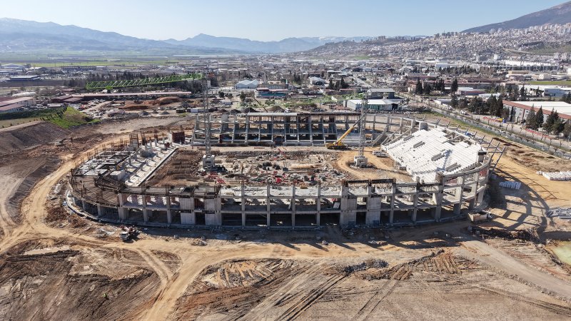 Şehrin uzun yıllardır özlemle beklediği ve en önemli ihtiyaçlarından biri olan stadyum projesinde çalışmalar tüm hızıyla devam ediyor. Dulkadiroğlu İstasyon Mahallesi’nde hayata geçirilen modern stadyum projesinde önemli aşamalar geride bırakılırken, inşaat sahasında yoğun bir mesai yürütülüyor. Toplam 2 Milyar TL’lik yatırımla şehre kazandırılan yeni stadyumun temel imalatları ve ana taşıyıcı sisteminin büyük bölümü tamamlandı. Proje kapsamında tribünlerin önemli bir kısmı da inşa edilirken, saha çevresindeki yapı elemanları ve tribün montaj çalışmaları eş zamanlı olarak sürdürülüyor. İnşaat sahasında yürütülen çalışmalar kapsamında kuzey, doğu ve batı tribünlerinde üçüncü kata ulaşılırken, güney tribünün inşası da büyük bir hızla ilerliyor. Tribün bloklarının yükselmesiyle birlikte stadyumun genel silueti de her geçen gün daha belirgin hale geliyor.
