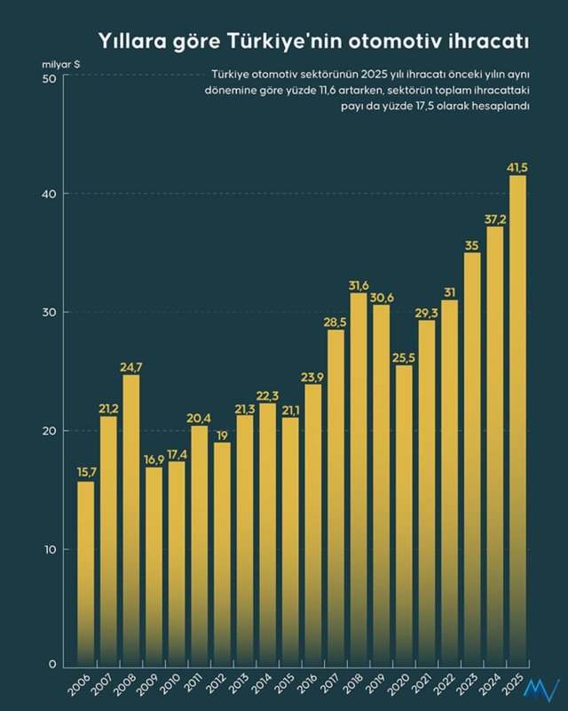Uludağ Otomotiv Endüstrisi İhracatçıları Birliği verilerinden yaptığı derlemeye göre, 2024'ü 37 milyar 197 milyon 332 bin dolarlık dış satımla kapatan otomotiv endüstrisi, geçen yıl ihracatını yüzde 11,6 artırarak 41 milyar 521 milyon 96 bin dolara yükseltti.
