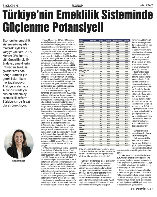 Ekonomim Dergisi, Marsh McLennan (NYSE: MMC) çatısı altında faaliyet gösteren ve kurumların yatırım hedeflerini gerçekleştirmelerine, işin geleceğini şekillendirmelerine ve çalışanlarının sağlık ve emeklilik sonuçlarını iyileştirmelerine destek veren küresel danışmanlık lideri Mercer ile yatırım profesyonellerinin küresel birliği olan CFA Enstitüsü, 17’nci yıllık Mercer CFA Enstitüsü Küresel Emeklilik Endeksi (MCGPI) sonuçlarını açıkladı. 2025 yılında Hollanda, İzlanda, Danimarka ve İsrail emeklilik gelir sistemlerindeki A olan notlarını korudu. Singapur ise bu yıl ilk kez A notu alarak Asya kıtasında bu dereceyi elde eden tek ülke oldu. Türkiye, sıralamada 49’uncu sırada yer alıyor. Şeffaflığın artırılması, yönetişim uygulamalarının güçlendirilmesi ve kamu ile özel emeklilik sağlayıcıları arasındaki iş birliğinin teşvik edilmesi, sürdürülebilir bir emeklilik sistemi inşa edilmesinde önemli rol oynayabilir.