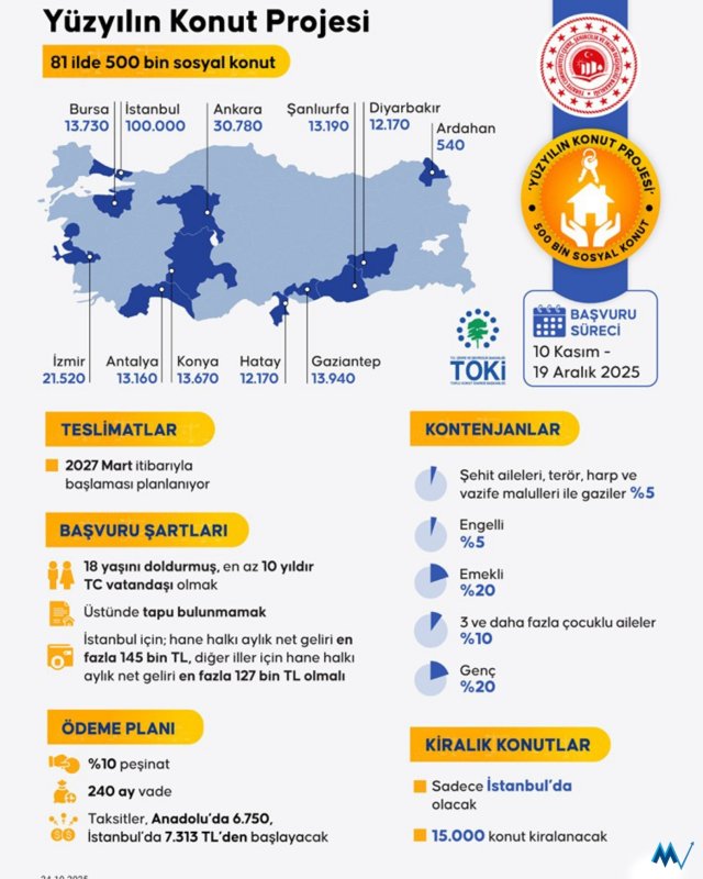 Projeyle Türkiye'nin 81 ilinde toplam 500 bin sosyal konut hayata geçirilecek. Bu kapsamda ilk etapta inşa edilecek konutların illere göre dağılımı şöyle: