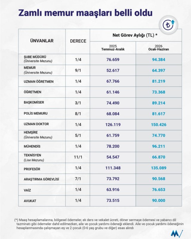 Bu artışlar neticesinde Ocak 2026 itibarıyla bazı kamu görevlilerinin net görev aylığı şöyle belirlendi: